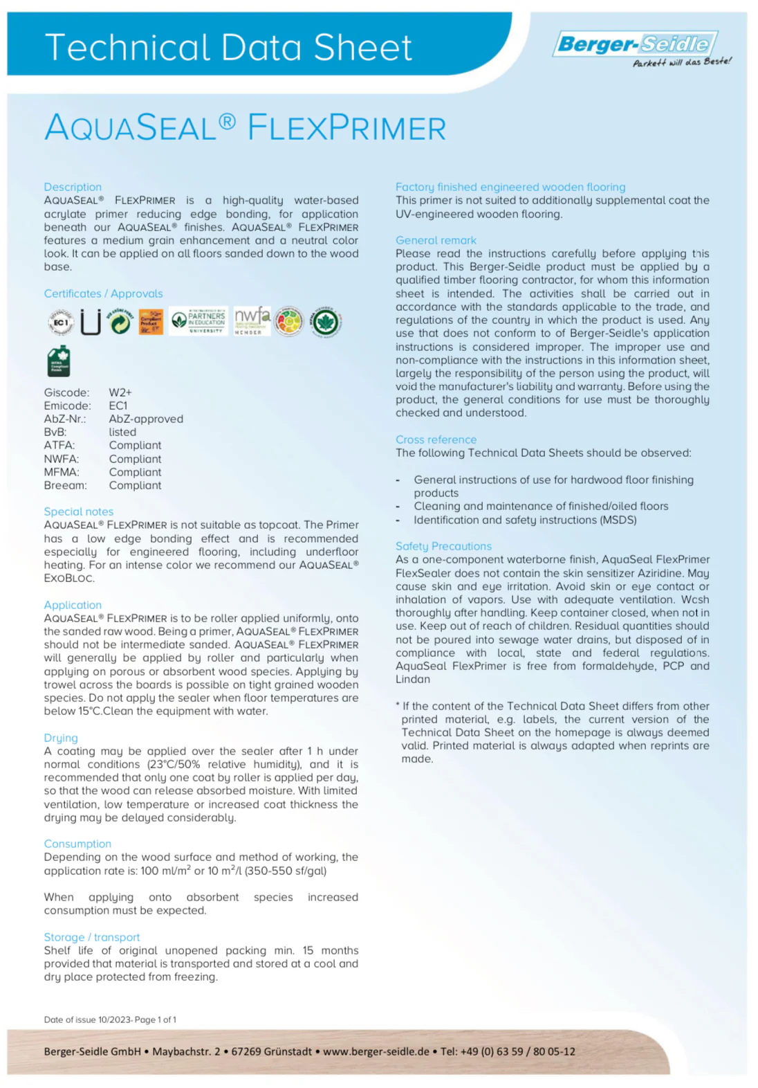 Application: AquaSeal FlexPrimer is to be roller applied uniformly, onto the sanded raw wood, particularly when applying on porous or absorbent wood species. Application by trowel across the boards is possible on tight grained wooden species. Clean the equipment with water.